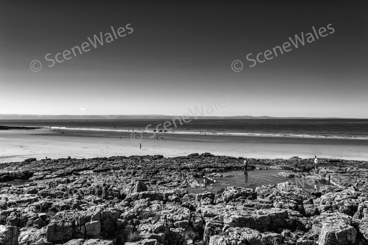 Explore the serene beauty of a rock pool near a beach with this captivating artwork featuring boys and a dog in a playful moment amidst the natural surroundings.